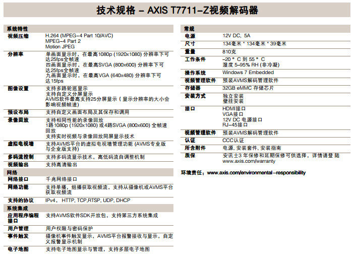 AXIS T7711-Z視頻解碼器 高性能的單路高清視頻解碼器解決方案 AXIS T7711-Z視頻解碼器采用高緊湊型設計,因此十分適合安裝于空間狹小的監 控場所,為小型監看環境提供了理想而靈活的選擇。該產品采用了高清視頻輸出, 保證了穩定而高效的解碼性能。 AXIS T7711-Z 能 夠 以 全 幀 速 及 高 達 1080p (1920x1080) 的HDTV高清分辨率,解碼H.264, MPEG-4以及M-JPEG視頻流。 在高清顯示屏上,AXIS T7711-Z提供了多種靈 活的顯示模式,可以支持單畫面1080p全幀速 的HDTV高清視頻畫面輸出,或者支持四畫面 高達SVGA (800x600) 的全幀速高清畫面。AXIS T7711-Z支持VGA輸出,可連接傳統顯示屏。 AXIS T7711-Z提供了比使用PC連接顯視器更為 經濟高效的解決方案,直接從前端視頻設備獲取 高清視頻流進行視頻顯示。 AXIS T7711-Z結合AVMS管理平臺,用戶可以進 行多路視頻的實 時畫面與回放錄像之間的自由切 換與顯示。 AXIS T7711-Z也提供了開放性接口,集成于視頻 管理系統,支持各種規模的視頻顯示系統。 數據表 > 解碼多種視頻流 H.264, M-JPEG, MPEG-4 > 支持1080p HDTV 高清視頻輸出 > 可定義化的視頻 顯示模式與分屏 組合 > 千兆網絡鏈路 > 無縫支持AVMS 管 理平臺 技術規格 - AXIS T7711-Z視頻解碼器 系統特性 視頻壓縮 H.264 (MPEG-4 Part 10/AVC) MPEG-4 Part 2 Motion JPEG 分辨率 單畫面顯示時,在最高1080p (1920x1080) 分辨率下可 達25fps全幀速 四畫面顯示時,在最高SVGA (800x600) 分辨率下可 達25fps全幀速 九畫面顯示時,在最高VGA (640x480) 分辨率下可 達15fps 圖像設置 支持多路輪巡顯示 支持自定義分屏顯示 AVMS軟件最高支持25分屏顯示(顯示分辨率的大小會 影響視頻幀速) 預設布局 支持自定義畫面布局及其保存和調用 錄像回放 支持相同性能的錄像回放 1路1080p (1920x1080) 或4路SVGA (800x600) 全幀速 回放 支持實時視頻與錄像回放同屏顯示技術 虛擬電視墻 支持AVMS平臺的虛擬電視墻管理功能 (AVMS專業版 與企業版支持) 多碼流控制 支持多碼流顯示技術,高低碼流自調整機制 視頻輸出 支持高清輸出 網絡 網絡接口 千兆網絡接口 網絡功能 支持單播,組播獲取視頻流,支持從攝像機或AVMS平臺 獲取視頻流 支持的協議 IPv4, HTTP, TCP,RTSP, UDP, DHCP 系統集成 應用程序編程 接口 支持AVMS軟件SDK開放包,支持第三方系統集成 用戶管理 用戶權限與密碼保護 事件觸發 攝像機事件觸發顯示,AVMS平臺報警接收與顯示,自定 義報警顯示機制 電子地圖 支持電子地圖顯示與管理,支持多層電子地圖 常規 電源 12V DC, 5A 尺寸 134毫米 * 134毫米 * 39毫米 重量 810克 工作條件 –20 °C 到 55 °C 濕度 5–95% RH (非冷凝) 操作系統 Windows 7 Embedded 視頻管理軟件 預裝AVMS解碼管理軟件 存儲器 32GB eMMC 存儲芯片 安裝方式 獨立安裝 壁掛安裝 接口 HDMI接口 VGA接口 12V DC 電源接口 RJ-45接口 視頻管理軟件 預裝AVMS解碼管理軟件 認證 CCC認證 所含附件 電源, 安裝套件, 安裝指南 質保 安訊士3 年保修和延期保修可供選擇.